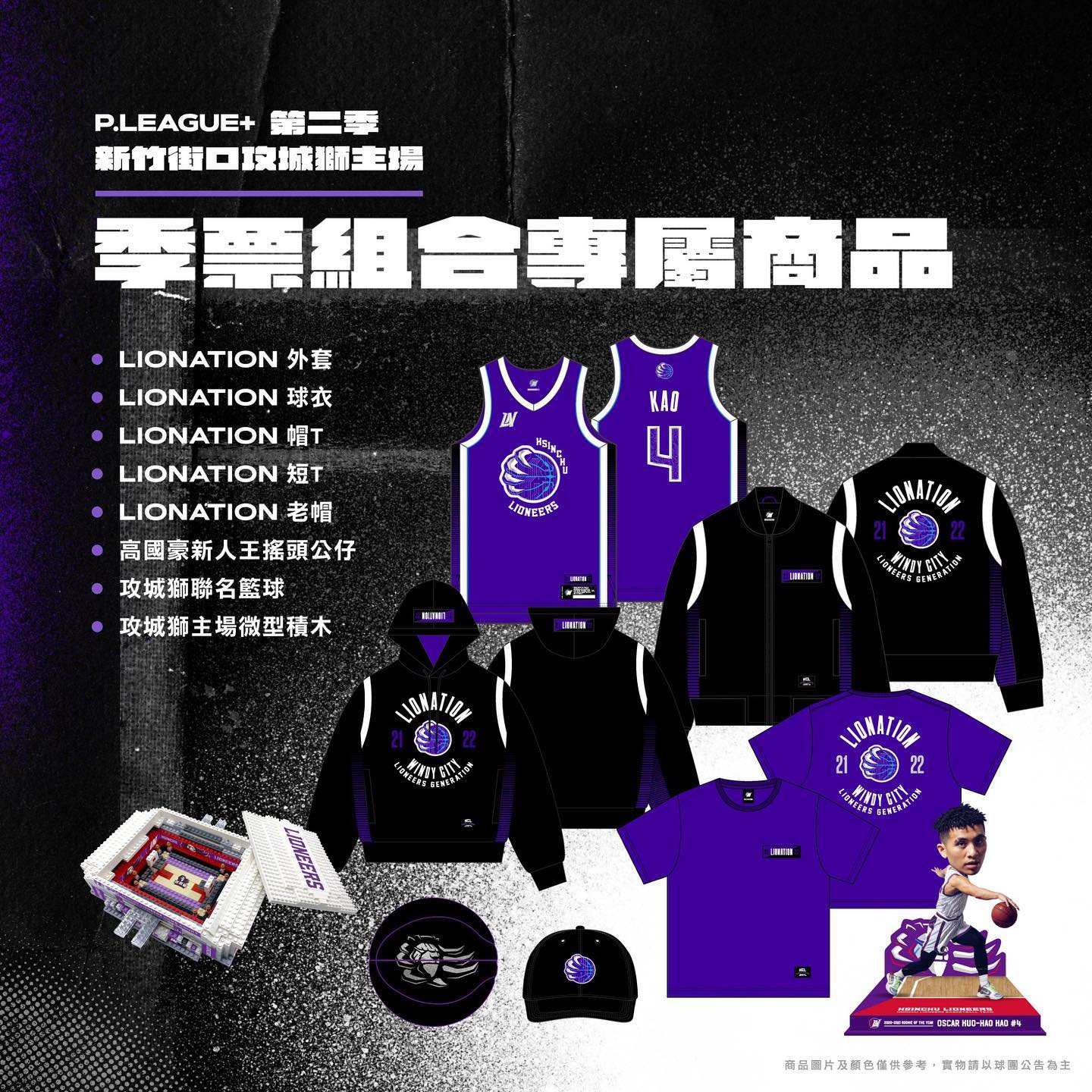 季票組合商品包含LIONATION外套、球衣、帽T、短T、老帽、攻城獅聯名籃球、高國豪新人王搖頭公仔(未來會市售)、攻城獅主場微型積木(未來會市售)。攻城獅球團本季季票共規劃7種席位,為提供球迷更多元的選擇,本屆會員方案中,獅心瘋區、獅吼區、特區、普通區將開放獅紫軍選擇「季票商品組合」與「純座位季票」兩種方案,各季票區域享有不同等級的會員福利,更詳細售票資訊請參考拓元網路售票系統:https://reurl.cc/XW1j7a