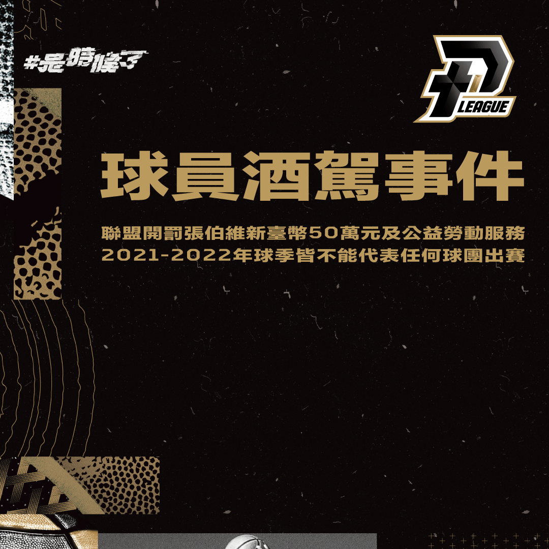 【9月2日新聞稿】P. LEAGUE+ 今(2)日針對高雄鋼鐵人球員張伯維酒駕事件召開仲裁委員會,會中決定聯盟將對張伯維開罰禁賽觀察期1年,執行期間為2021-2022年球季張伯維皆不能代表任何球團出賽,外加新臺幣50萬元以及最少300小時的公益勞動服務。