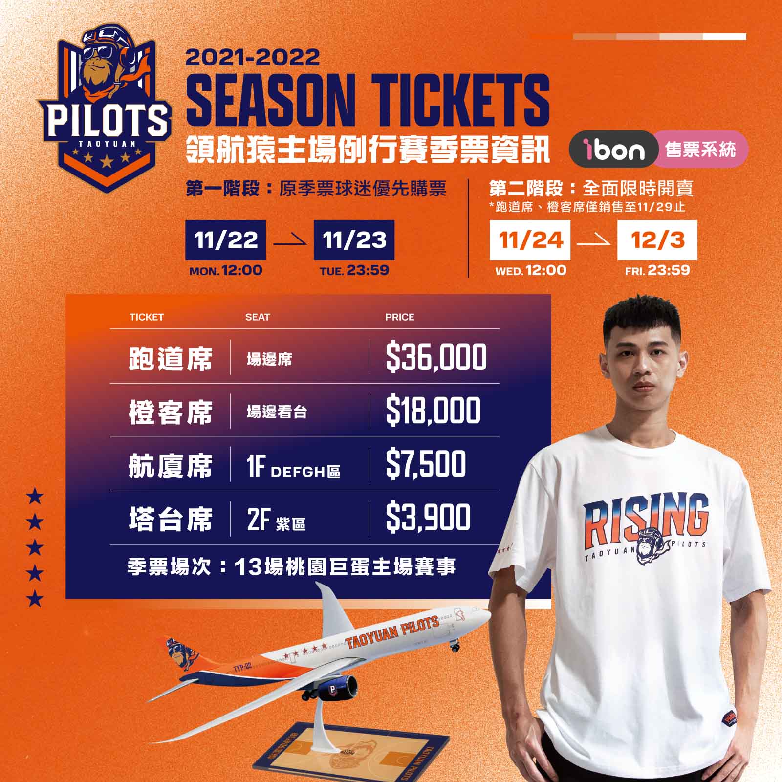 領航猿 2021-22 季票及開幕週 12/18、19 單場主場賽事門票,11 月 22 日12:00 起可於 ibon 售票系統購票,12/18 及 19 國體大漢堡館觀賽區域分為一樓特區 600 元及二樓看台區 350 元。售票分為兩階段:第一階段優先開放2020-21 季票球迷自 11/22(一)12:00 至 11/23(二)23:59 購買,第二階段於11/24(三)12:00 至 12/3(五)23:59 全面限時開賣,獨家搭贈飛機模型的跑道席及橙客席季票僅銷售至 11/29(一)止,想收藏的橙客趕緊把握機會,完成購票準備登機啦!(詳細售票資訊請參考桃園領航猿官方粉絲專頁公告)
