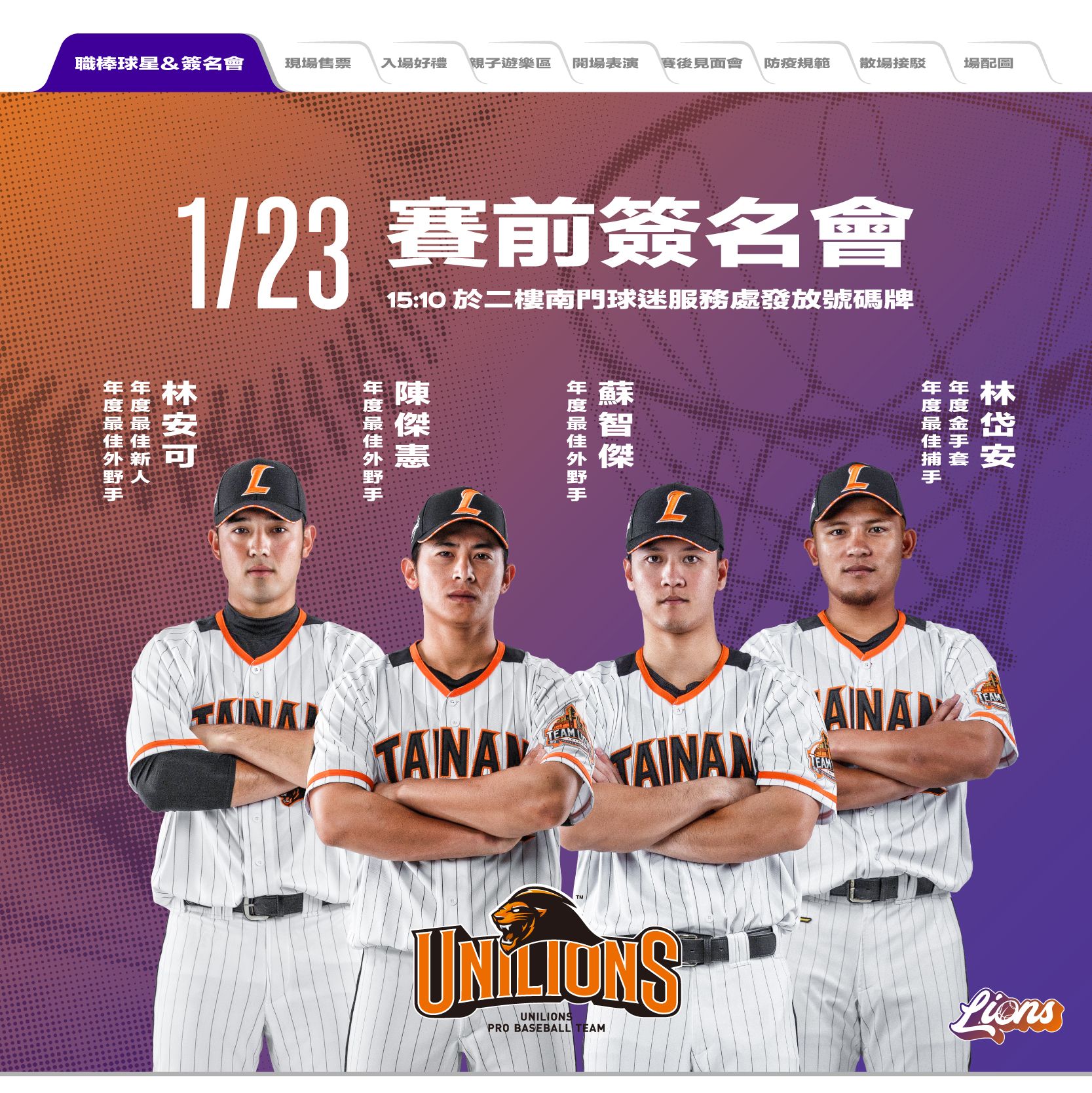攻城獅上半季最終主題週「雙獅好友日」將於1月23日展開,攻城獅球團與統一獅球團利用上個休賽季積極規劃年度合作項目,除了雙方球星輪流造訪對方主場外,商品與行銷團隊也一同開會設計聯名主題日商品,攻城獅球星將在主題日當天披上「UNILIONEERS雙獅限定條紋球衣」出賽,此款球衣採用雙方主視覺紫色與橘色漸層,並搭配棒球衣條紋元素襯底,將籃棒特色完美結合。此款球衣售價$1580元,預計於1月14日在攻城獅官方商城開放預購。