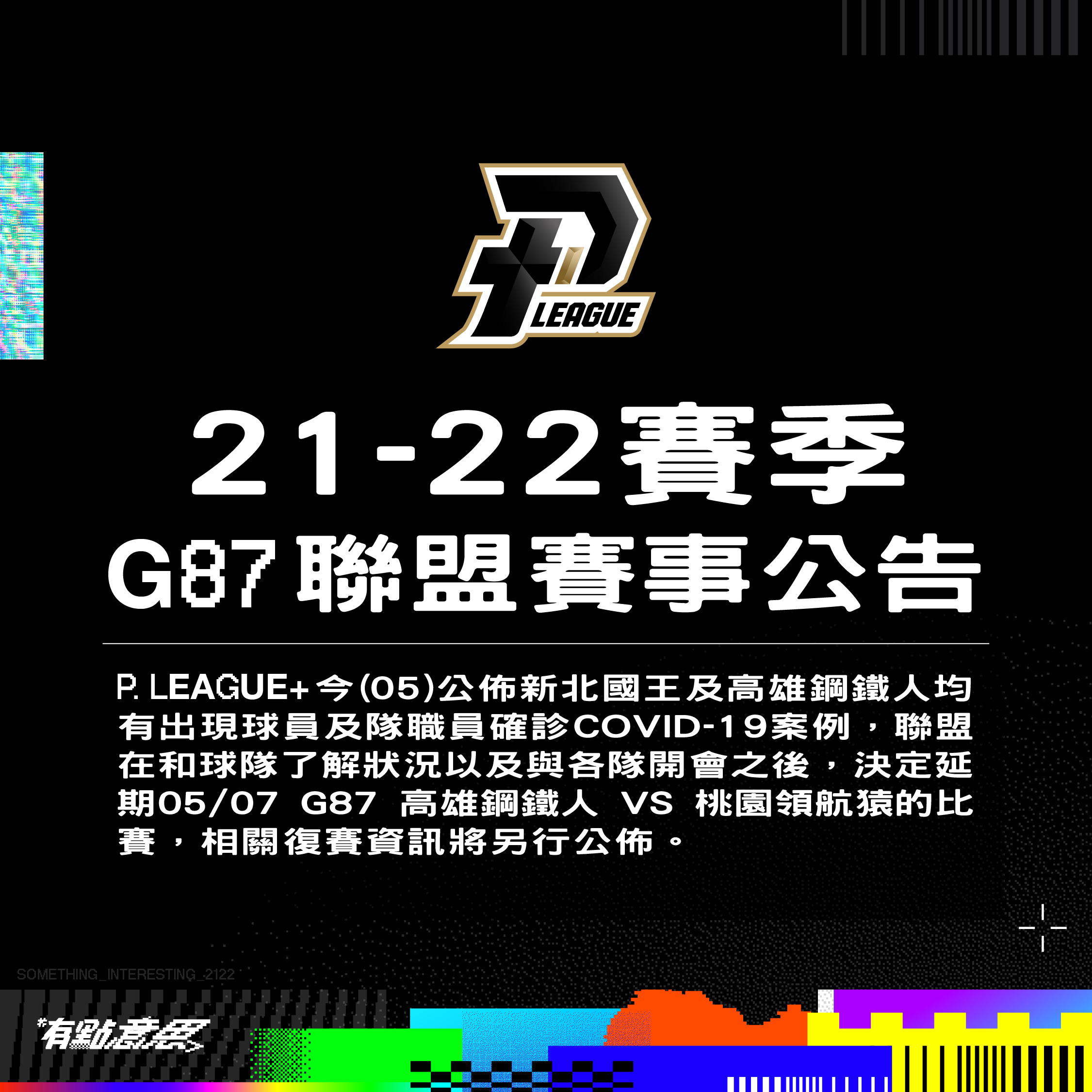 【5月5日新聞稿】P. LEAGUE+ 今日(05/05)公佈新北國王及高雄鋼鐵人均有出現球員及隊職員確診COVID-19案例,聯盟在和球隊了解狀況以及與各隊開會之後,決定延期05/07 G87 高雄鋼鐵人 vs 桃園領航猿的比賽,相關復賽資訊將另行公佈。