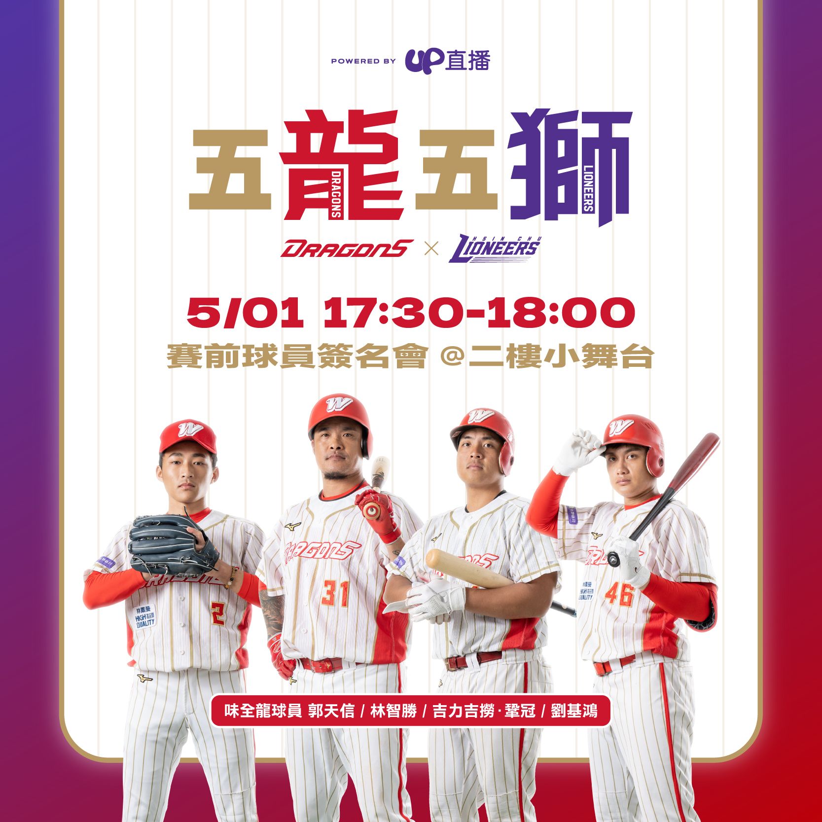 攻城獅球團於「Up直播五龍五獅」主題日規劃豐富活動,小龍女霖霖、小映、LIKE、口水、心璇、張晴與四位味全龍球星林智勝、吉力吉撈‧鞏冠、郭天信與劉基鴻將一同參與「龍來KG Ball」挑戰賽,活動名額僅開放18位,不僅能與小龍女、球星合作體驗棒球樂趣外,若成功晉級決賽還有機會獲得球星簽名!