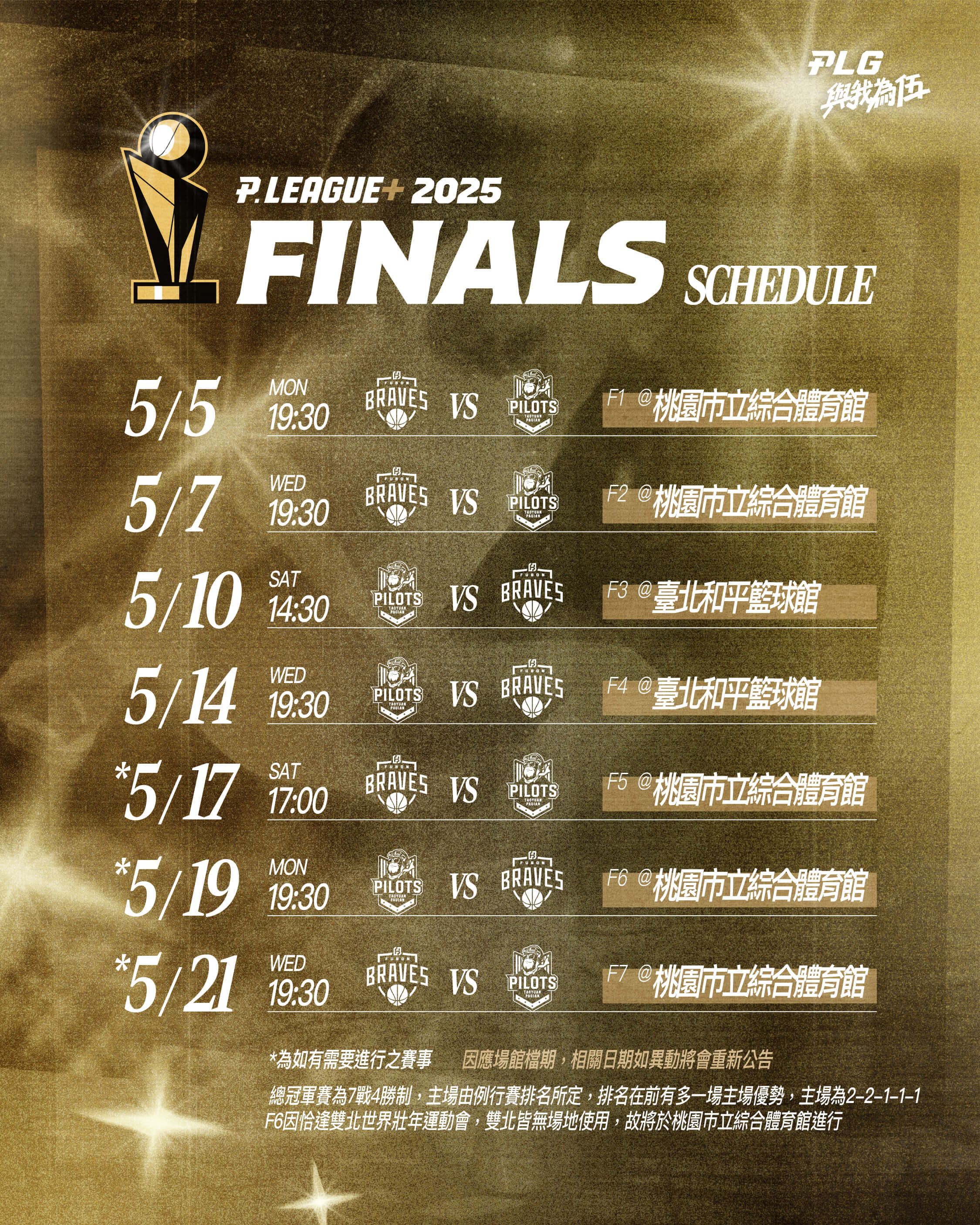 而為了讓球迷朋友可以在平日更無負擔地親身體驗總冠軍賽,由北區球隊對戰的這個組合平日賽程,也就是第1、2、4、6、7戰於桃園巨蛋的比賽將延後至當天19:30開打,讓球迷朋友下班之後仍能好整以暇前往球場,親身感受總冠軍賽的刺激與感動。