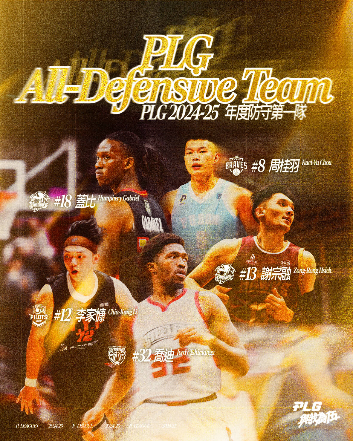 至於本季的年度防守第一隊,總共入選3名前場及2名後場球員。前場的部分,由喬迪領軍,搭配獵鷹雙星謝宗融(場均8.0籃板為聯盟非外籍球員第1)及蓋比(場均1.1阻攻為聯盟非外籍球員第1),這個組合在籃板保護和禁區威嚇都算是聯盟本季一時之選。在後場方面,領航猿的李家慷場均1.7抄截(僅次於喬迪為聯盟非外籍球員第1)3.2籃板,搭配勇士的周桂羽1.4抄截2.8籃板,2人除了防守數據有好表現之外,積極的防守意識讓他們時常不畏懼地貼身防守對方的後場重點球員,成為教練眼中最佳的防守大鎖,入選年度防守第一隊實至名歸。